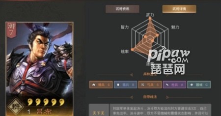 吕布这个武将输出能力是很不错的,而且兵种适性是有2个S级兵种和1个A级兵种的,所以在阵容的搭配上也是比较多的娥,同时他也是属于群阵营的一个武将,所以只要搭配合理都是有着很好的效果的。