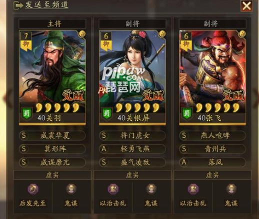 北伐枪的组合其实很简单,由关兴、张苞和SP诸葛亮组成,不仅有控制,还有稳定的抵御,这也是很多玩家非常喜欢这套阵容的原因,要知道减少兵损的方法除了抵御就是减伤了,而持续的减伤和回复也是使得北伐枪在各个版本中,都很强势,下面我们就来看看最高配置的北伐枪吧!