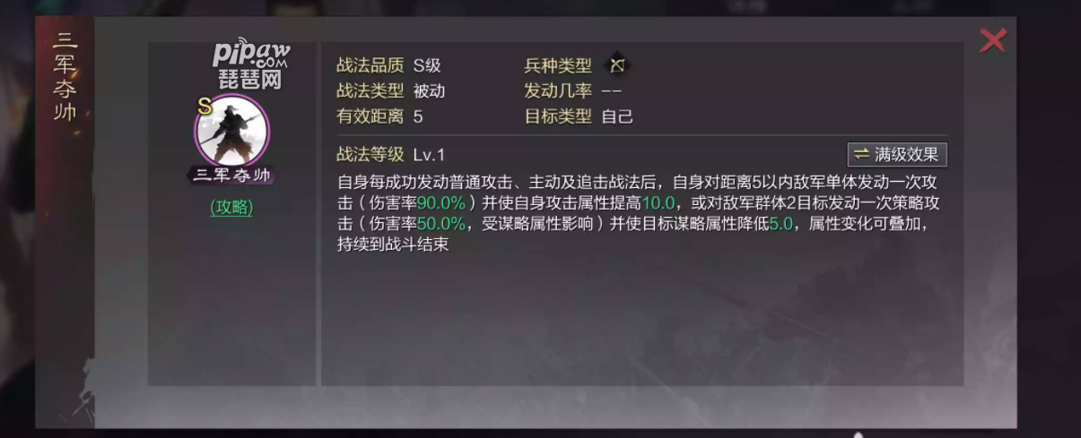 在率土之滨的游戏中,首先我们可以看到杜预这一武将的面板还是很不错的,有着很强的输出能力表现,爆发力也是不弱的。本身又自带被动阵法【三军夺帅】,一旦武将发动攻击,并且攻击到敌人以后那么杜预的的攻击力就会有10点 的提升,一旦攻击到2个敌人的话,那么会使得敌人的额谋略降低5个点,还会触发【三军夺帅】的阵法效果哦!【三军夺帅】不仅可以帮助杜预加强输出,还可以帮助加强武将的属性。这个对于没有氪金玩家来说,是个很好的武将人选,再加上杜预在阵容搭配中也是个比较百搭的角色,可以帮助玩家在游戏能够快速的发育。