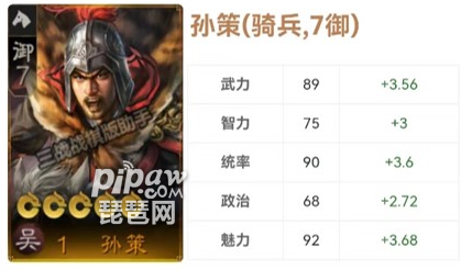 全武将武力第10,统率第9,智力31,属性优秀,技能是三棋最强控制技能震慑,每两回合废对面一个将,最大的槽点是技能伤害值偏低只有150%,但是整体来看孙策是非常优秀的前排控制,pvp作用类似LOL里的半肉上单。